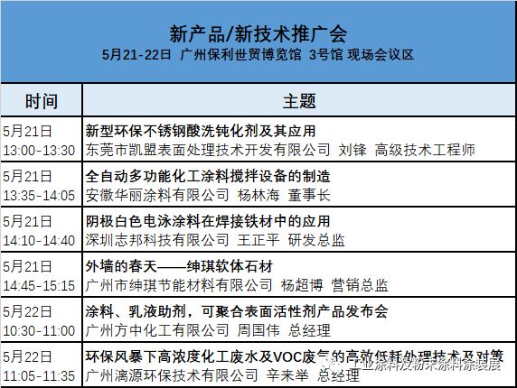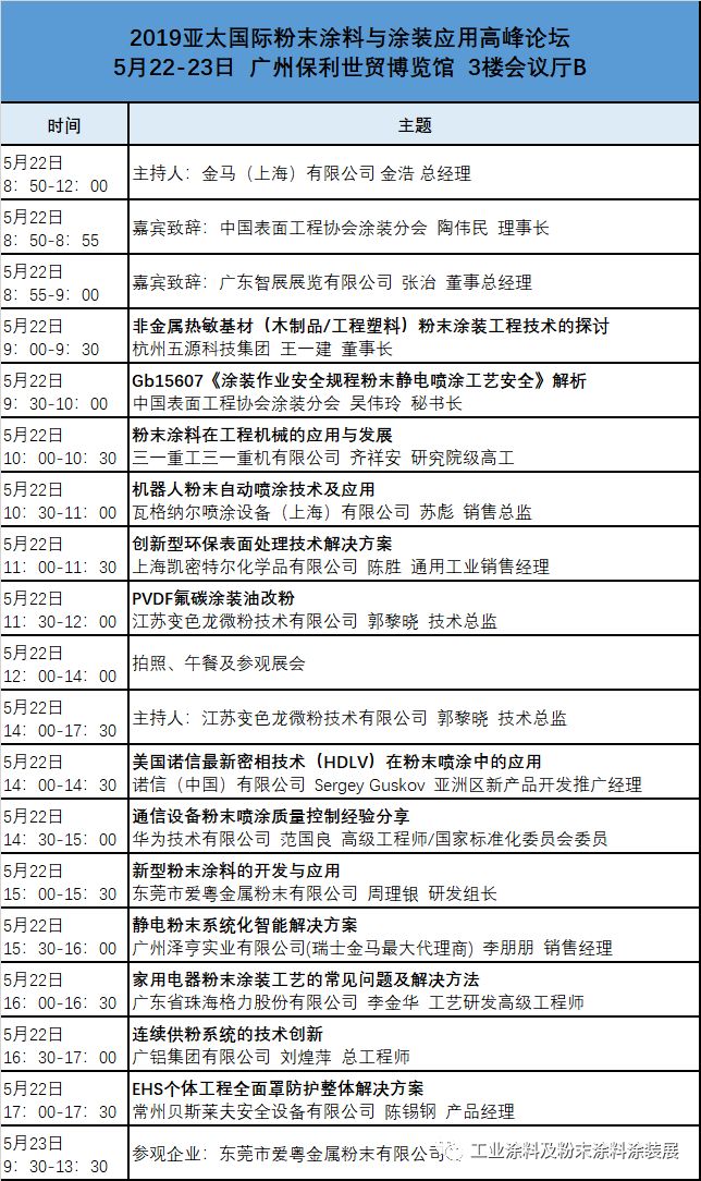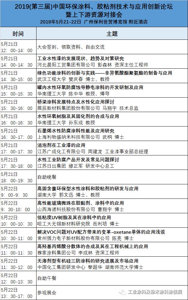 会议与展览会深度相结合是国际涂料、胶粘剂、工业涂料、粉末涂料涂装展的一大特色,本届展会将有70场次国际性论坛、行业会议、技术研讨会在同期举办,最新最前沿技术助力用户企业最大限度地创造产品价值。部分会议及议程如下: